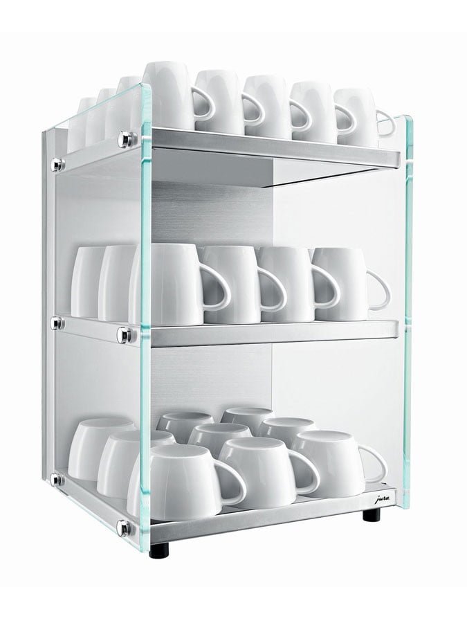 Thanks to its three storage surfaces, it provides plenty of space for a total of 100 espresso cups (diam. 60 mm) or 60 coffee cups (diam. 80 mm). The three modern heating panels are energy efficient and run silently, which makes the product ideal for use in offices.