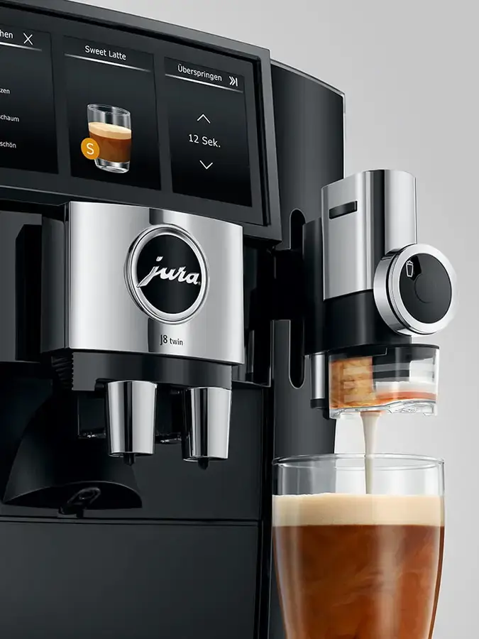 The J8 twin can prepare 31 delicious specialities. With two conical grinders, the machine boasts maximum flexibility when it comes to creating tasty beverages. Every coffee is made to meet your personal taste, always freshly ground with your favourite coffee blend, strong or mild, regular or decaf. In short, it boasts the advantages of two coffee machines in one compact device. And yet this talented all-rounder can do even more. It’s possible to flavour the milk foam to give it a subtle sweet note and thus open up an entirely new world of taste. There’s no limit to what can be created, from the classic, simple espresso to the stylish Sweet Latte.